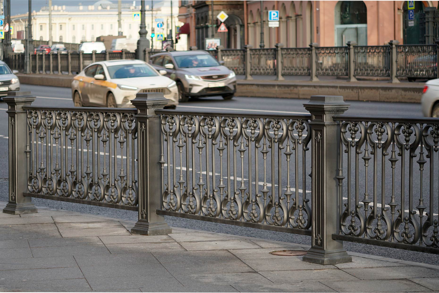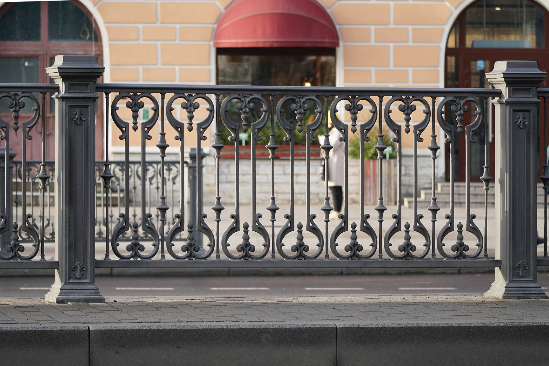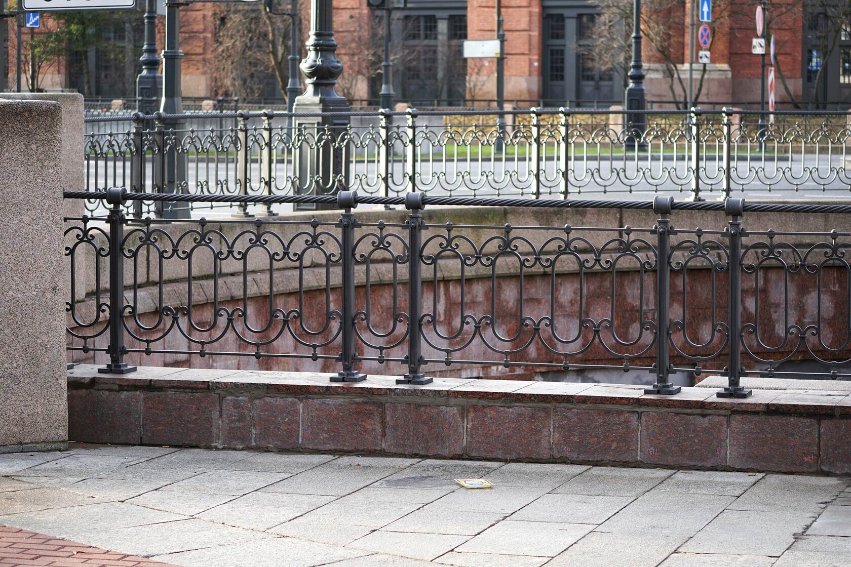 Эта изящная решетка, выполненная в классическом стиле, служит не только ограждением, но и украшением городского пространства. Она привлекает внимание своим утонченным дизайном: вертикальные прутья с декоративными наконечниками соединены ажурными горизонтальными элементами, образуя ритмичный узор. Массивные столбы с фигурными основаниями и верхушками придают решетке монументальность и солидность. Темный цвет металла гармонично сочетается с цветами городского ландшафта, создавая впечатление благородства и сдержанной элегантности. Эта решетка — прекрасный пример того, как функциональность и эстетика могут сосуществовать в гармонии, делая городскую среду более комфортной и привлекательной.